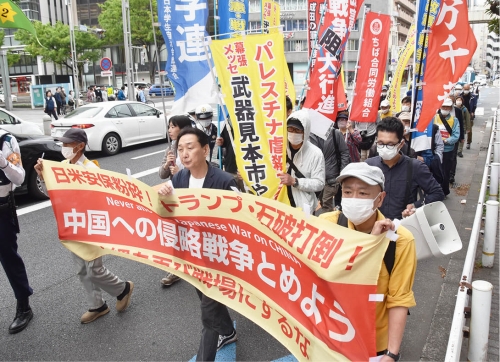 最初に「改憲・戦争阻止!大行進」呼びかけ人の森川文人弁護士が講演を行い、「中国侵略戦争情勢の加速に、戦争をしなければ生き延びられない帝国主義、これに『自国帝国主義打倒』を対置し、資本主義を打倒しよう」と呼びかけた。