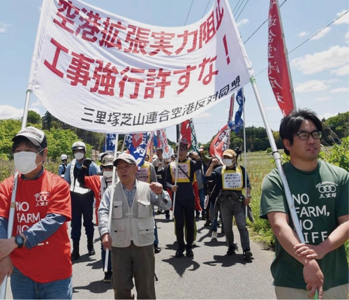 米日帝国主義による中国侵略戦争阻止の4・28沖縄デー闘争が全国で闘いとられた。実力闘争こそ力だ。「反戦の砦(とりで)」=三里塚もまた決戦局面へと突入している。成田空港会社(NAA)の田村明比古社長は4月4日、中野洋昌国土交通相に、B滑走路延伸とC滑走路(第3滑走路)新設の工事について「5月に本格着工する」「2028年度末に供用開始する」と報告した。三里塚芝山連合空港反対同盟はこの攻撃に怒りをたぎらせ現地闘争(フィールドワーク&デモ)を呼びかけた。5月7日、反対同盟、現闘本部、支援連絡会議、首都圏の労働者・学生など60人が参加し、「成田空港機能強化粉砕、5月本格着工阻止」を掲げたデモを打ちぬいた。