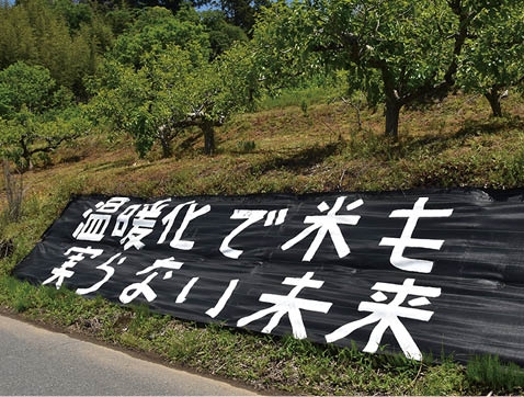 各所には、「地盤改良工事」の資材置き場、セメント作りの施設、さらに機動隊バスの駐車場までが、鉄のフェンスに囲われて作られている。重機と作業員が動き、上空をジェット機が騒音と共に飛来する。デモが北上を続けると、機能強化に反対する農民が作った抗議の「横断幕」が参加者の目に飛び込んできた。農業用の防草シートを使って土手に、「温暖化で米も実らない未来」「もっと死を、もっと環境破壊、CO2を」と書き表されている。