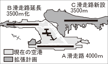 B滑走路の北延伸による3500㍍化、C滑走路3500㍍の新設、それにより年間発着能力の34万回から50万回への増加が予定されているが、用地の確保は8割までしか進んでいないと田村明比古自身が認めている。しかしもはや中国侵略戦争情勢の切迫が機能強化の停滞を認められなくなっているのだ。