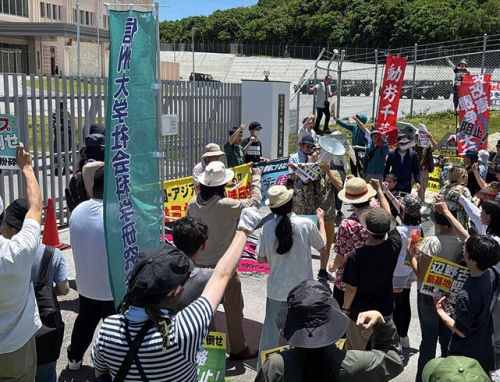 続いて、陸上自衛隊第15旅団の司令部がおかれる陸自那覇駐屯地への申し入れを行った。牛島の「辞世の句」を公式サイトに掲載する同旅団は来年にも師団化が狙われている。権力の不当な介入はねのけ、「第15旅団を解体しろ!」と怒りのシュプレヒコールをたたきつけた。