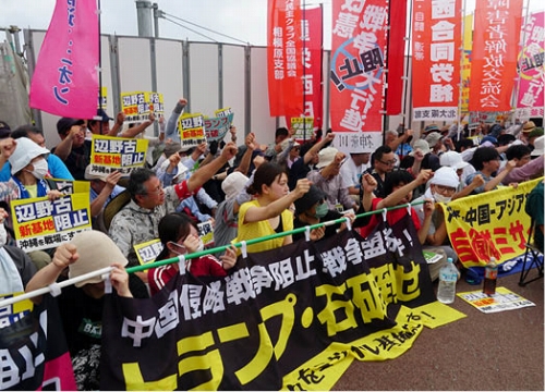 19日は、名護市辺野古で座り込み闘争に参加した。普段は9時に現れる資材を乗せた車両が時間になっても現れなかった。現地で闘っている方が「搬入を止めました! 座り込みを強制排除するための機動隊も来ていません。大勝利です!」と宣言。400人の座り込みで工事車両の搬入を実力阻止したのだ。勝利をかみしめながらマイクアピール、シュプレヒコール、歌を繰り返す。地元の方からは「命ある限り闘います」「若い方たちがこれだけ集まって頑張っていることがうれしくて涙が出てきます」と発言が相次いだ。