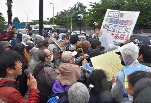 改憲・戦争阻止!大行進東京、同三多摩は5月31日、米軍横田基地(東京都福生市)を直撃する反戦反基地デモを90人の結集で闘った。デモ後に自衛隊と米軍への申し入れ行動。日米安保体制の実体=横田基地に置かれる在日米軍司令部の中国侵略戦争の前線司令部へアップグレード、出撃基地化を許さないと徹底弾劾した。阻止線を張る機動隊と激突しながら実力抗議をたたきつけた。