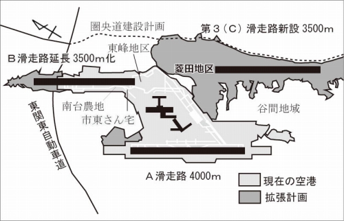 右肩上がりの航空需要予測をもとに2030年に訪日観光客数が6千万人になるとして、年間発着枠を50万回にする攻撃。観光先進国の実現は「国家プロジェクト」だと押し出している。「更なる機能強化」と「新しい成田空港」構想と呼んでいたものをあわせたものの新しい呼称。①3500㍍C滑走路を新設、②B滑走路を1千㍍北延伸し3500㍍化、③空港運用時間の延長(午前5時~午前1時に)、④3つのターミナルを1つに集約し新設、⑤鉄道の複線化など交通アクセスの改善、⑥貨物地区の再編・統合。これらにより空港敷地面積は現在の1198㌶の約2倍の2297㌶に拡張する。