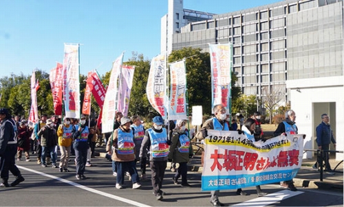 1月4日、大坂正明同志奪還、東京拘置所包囲闘争が120人の結集で闘われた。主催は大坂正明さん救援会と東京労組交流センター。1971年11・14渋谷暴動闘争を闘い、でっち上げ「殺人罪」で2023年12月に懲役20年の極反動判決を受けた大坂同志への激励デモを行った(写真)。婦人行動隊の木内敦子さんと現闘の仲間が参加。