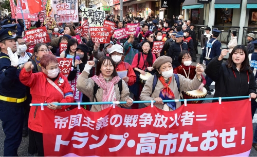 集会後、会場前で妨害を図る右翼を蹴散らし出発した解放感あふれるデモに注目が集まり、高校生も合流して、「中国侵略戦争阻止! 高市打倒!」と共に声を上げ、こぶしを突き上げた。