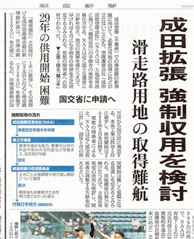 朝日新聞は4月1日、「成田拡張 強制収用を検討」の記事を1面トップで掲載した。(写真)