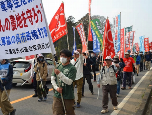 雨もどうやら大丈夫で、意気軒高とデモ出発です。かつては空港反対運動に身を置いていた石井新二らが土地収用法の事業認定を提言して、国家暴力を振りかざしての軍事空港建設の攻撃が迫ってきている只中において、これを徹底弾劾してふっとばす力強いデモをやりぬくことができました。耕作権裁判の控訴審に向かっての陣形を固める闘いとすることもできたと思います。