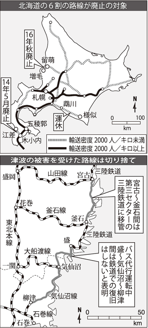 JR北海道は赤字線の廃止を次々と実行に移している。8月10日、JR北海道は留萌(るもい)線の留萌―増毛(ましけ)間を16年秋に廃止すると沿線自治体に通告した。今年1月に高波の被害で不通となった日高線の鵡川(むかわ)―様似(さまに)間についても、工費は同社が負担できる限度を超えるとして、復旧を拒んでいる。