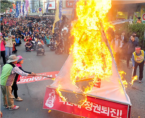 10月17日には韓国南部の昌原(チャンウォン)で、地域の労働者と農民1千人余が民衆大会を開き、11・14ソウルにともに上京して闘うという共同宣言を発した。農民の代表は、民主労総の掲げる「ひっくり返そう、財閥の世の中! 打ち倒そう、資本家の政府!」のスローガンを、今や農民も前面に掲げて闘う時だと発言した。そして「労働者とともに腐った世の中を覆し、民衆が主人になる世の中をつくろう」と訴えた。