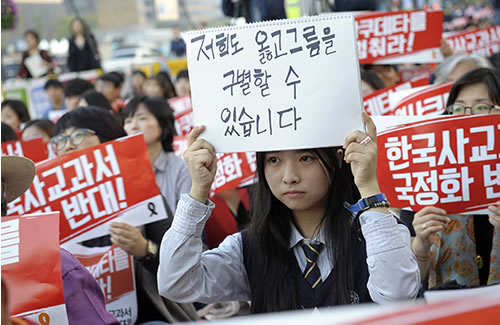 こうした中で、歴史教科書問題がパククネと労働者人民との新たな対決点に浮上した。パククネ政権はこのほど、中学・高校の歴史教科書の記述が「左翼偏向」しているとし、「正しい教科書」を国定教科書として作り全国の学校で使用を強制する方針を打ち出した。その目的は、かつての軍事独裁政権時代の美化と復権にある。