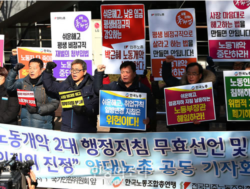 韓国の二大労総が共同記者会見 週刊『前進』04頁(2721号01面03)(2016/02/08) 韓国の二大労総が共同記者会見 民主労総と韓国労総は2月1日、ソウルで共同記者会見を開き、パククネ政権が打ち出した「簡単な解雇」などを可能にする政府指針を「全労働者への宣戦布告」と弾劾し、その廃棄へともに闘いぬくと宣言した。すでに製造業や公共部門で具体的な共闘への動きが開始されている。 Tweet 前の記事 次の記事