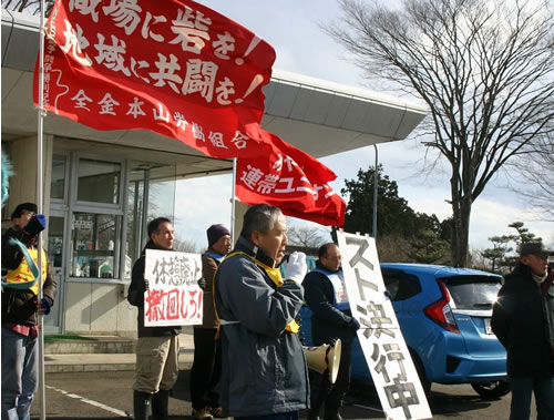 (写真 本山製作所構内でスト突入集会をかちとる全金本山労組と支援者【1月28日 宮城県大衡村】)