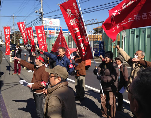 2月11日、組合は身勝手な吉崎資本=山下ゴム資本に対する抗議行動に立ち、戦闘宣言をたたきつけた。それは「会社解散」を撤回させ、労働者が安心して働くための闘いだ。