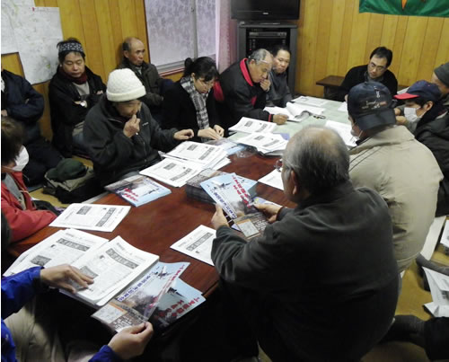 萩原富夫さんは「3・27集会も近い。緊張感をもって一日思う存分闘おう。同盟ニュースと一緒に3・27に向けたカラービラも配ろう」と提起した。今回で第30号の「反対同盟ニュース」は、3・27集会が成田ニュータウンのど真ん中・赤坂公園で開かれることをアピールしている。さらに、黒野匡彦・元NAA社長が2月16日の芝山町で講演し「タブーを破って第3滑走路建設・深夜便延長を」と要求したことを弾劾している。
