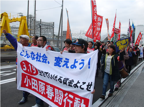 動労神奈川と神奈川労組交流センター、国鉄闘争全国運動・神奈川が主催して3月19日に小田原で開かれた春闘集会には80人余が結集した。JR東日本の子会社・東日本環境アクセス小田原事業所による動労神奈川の時廣慎一組合員に対する解雇に決定的な反撃をたたきつけた。