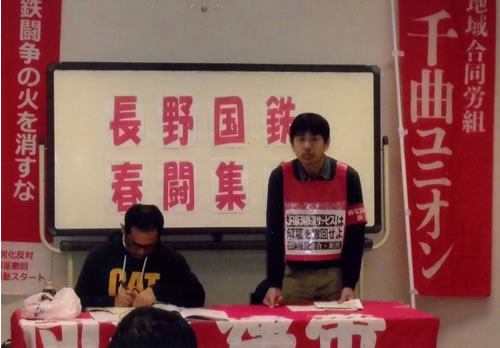 基調報告で、国鉄1047名解雇撤回・JR採用を求める新署名に取り組み動労総連合・長野を建設していくこと、非正規職撤廃・労働法制大改悪粉砕を闘い千曲ユニオン青年部を先頭にストを闘う職場拠点をつくり出していくことが訴えられました。特にブラック企業での苦闘の中から「滅私奉公」のイデオロギーを突き破り「労働の奪還」―真の団結の思想をつかみ取った総括は大きく全体を獲得しました。