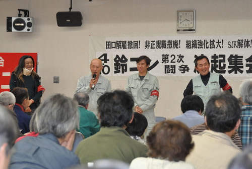 数日前には、佐藤重夫組合員の「60歳定年・解雇」をうち破り、雇用継続をもぎ取った。〝60歳で解雇。賃下げをのむなら再雇用〟という組合つぶしを狙った解雇策動を粉砕し、「鈴コン第2次闘争」の緒戦の勝利を引っさげての集会だ。