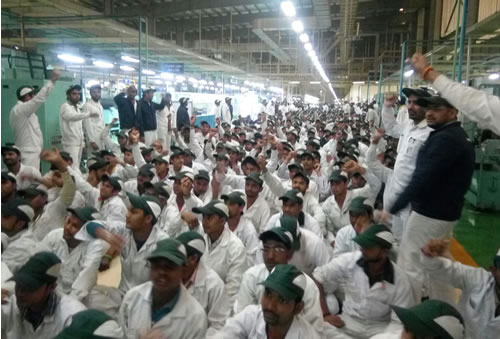 2月16日、インドのデリー郊外、ラジャスタン州にある本田技研工業100%出資の子会社ホンダ・モーターサイクル・アンド・スクーター・インディア(HMSI)のタプカラ工場で、日勤の労働者2千人が工場内に座り込むストライキを敢行した。発端は、塗装部門で働く契約労働者が残業を拒否したところ、上司の上級エンジニアから暴行を受けたことにある。この労働者は数日間連続して残業を命じられ体調がすぐれなかった。これを目撃した同僚の労働者たちは怒り、生産をストップさせ、全員が抗議の座り込みを始めた。管理職のこうした蛮行は日常茶飯事で、労働者の我慢は限界に達していたのだ。労働者たちは、非暴力的な座り込みで団体交渉を求め、要求を実現しようとしていた。