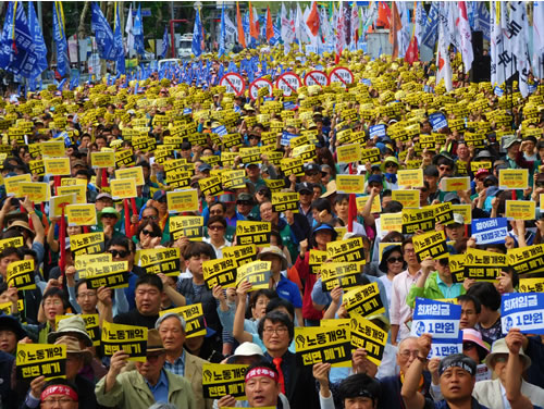 韓国・民主労総は5月1日、ソウルをはじめ全国15地域でメーデー大会とデモ行進を闘った。ソウルでは2万人(写真)、全国で合わせて5万人が集まった。スローガンには、①労働改悪廃棄・労働部長官退陣、②経済危機の主犯である財閥の責任追及、③最低賃金1万ウォン獲得、④週35時間労働制導入、⑤間接雇用・特殊雇用労働者の労働基本権保障、の5大要求が掲げられた。