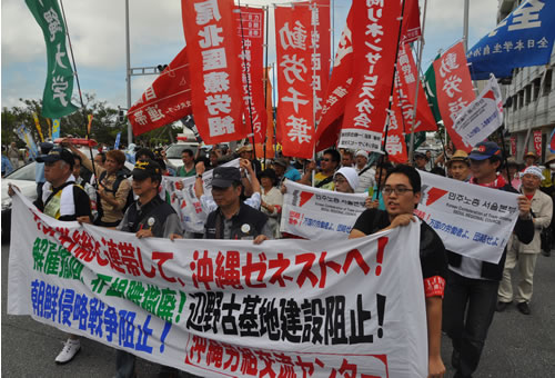 翌15日は県民大会に登場し、平和行進に参加した全国の労働者に「非正規職撤廃・基地撤去」と1面大見出しの『前進』を配布し、新国鉄署名を集めた。県民大会後には沖縄労組交流センター主催で元気よくデモ行進。