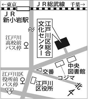 行き方 JR新小岩駅から徒歩20分/JR新小岩駅または都営新宿線船堀駅から都営バスに乗り「江戸川高校前」「江戸川区役所前」で下車