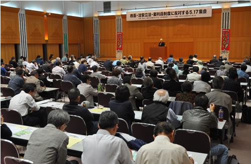 5月17日、東京・霞が関の弁護士会館2階クレオで「改憲・治安立法・裁判員制度に反対する5・17集会」が210人の参加で開かれた。おりしも国会で盗聴拡大・司法取引・証人隠しなどを狙う新捜査手法法案(刑事訴訟法改悪など)の採決が狙われており、これと真っ向から対決してかちとられた。