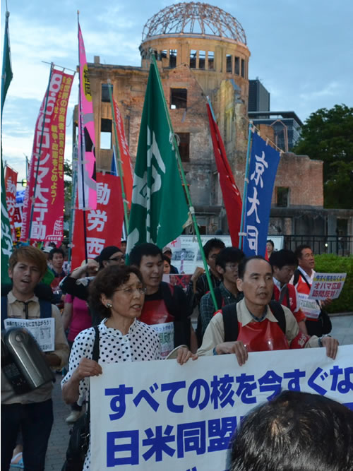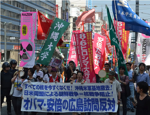 「核と戦争をなくすのは、核と戦争を必要とする『1%』の利益を守るオバマや安倍のような支配権力者ではない。全世界99%の労働者民衆の団結です。国際連帯です。私たちはヒロシマの怒りをもってデモに立ちあがります」(8・6ヒロシマ大行動実行委員会アピール)