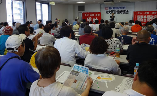 5月22日、堺市鳳(おおとり)で、戦争と非正規化とたたかう南大阪労働者集会が、120人の結集で大成功しました。堺に新たにできた関西合同労組の二つの分会が参加し、感動的な集会となりました。