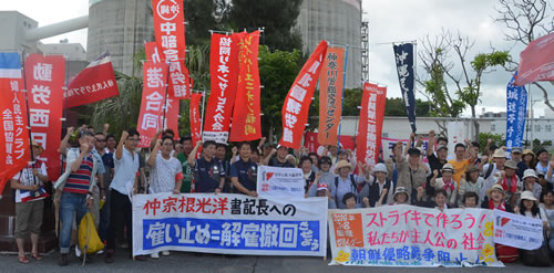 しかし私たちIJBS労組は、非正規職・派遣労働者が99%の職場で闘う労働組合を結成し、憲法違反とも言える派遣法のもとですべてを奪われ無権利である職場において、「非正規職撤廃」を掲げて闘い抜いてきました。仲宗根書記長に対する雇い止め・解雇という労働組合の壊滅攻撃に対し、一歩も退かずに団結の旗を守り抜き、責任のがれをする派遣先企業をも引きずり出し、派遣法そのものをたたきつぶす力関係をつくり上げようとしています。
