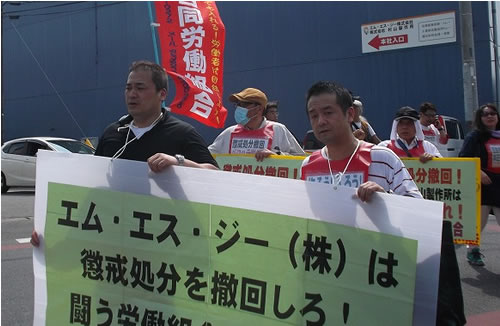 これに対して5月26日、15人の組合の仲間で会社を包囲するデモを行いました。社長も、まさかデモまでやるとは思っていなかったと思います。労働者と組合をなめていたのでしょう。