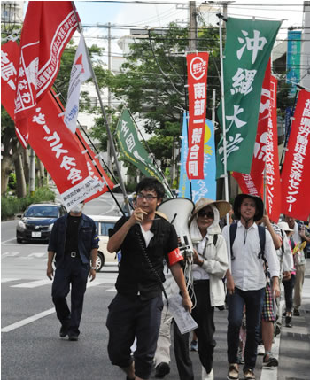 集会終了後、奥武山公園駅で「今から私たちと一緒に、怒りのデモに打って出よう!」と参加者に訴えると、参加者から拍手が起こりました。沖縄労組交流センター、福岡県労組交流センター、沖縄大学自治会、百万人署名運動・熊本連絡会(準)の旗を林立させ、デモは力強く那覇市内へ繰り出しました。「基地撤去!」「ゼネストで闘おう!」とアピールしながら沖縄県庁まで権力の妨害をはねのけ、デモを貫徹しました。