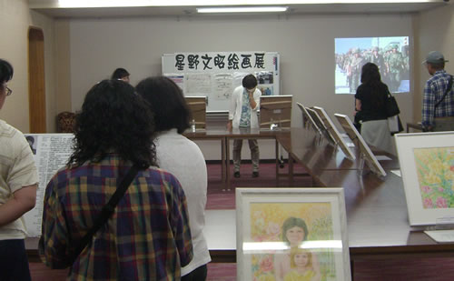吹田市教組(日教組)の組合大会の会場で行った星野絵画展では、大会に参加したある分会の8人全員が絵画展に参加してくれました。月1回分会会議を行い、討論して必要なら校長交渉を行い、職場支配権の確立めざして職場闘争を闘ってきたからできたものです。