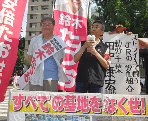 (写真 応援演説に駆けつけた動労千葉の田中康宏委員長【右】と並ぶ鈴木たつお候補【7月2日 JR阿佐ケ谷駅南口】)