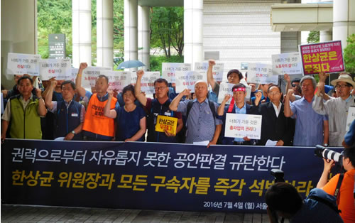 民主労総は直ちに「権力から自由でない公安判決を糾弾する! ハンサンギュン委員長とすべての拘束者を即刻釈放しろ!」と大書された横断幕を掲げて、怒りの記者会見を行った。