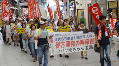 〝住民も労働者も被曝してはいけない〟。愛媛県職労が呼びかけた伊方原発再稼働阻止7・17集会に舞鶴、東京始め全国から150人が大結集し松山市内商店街から県庁へデモ(詳報次号)