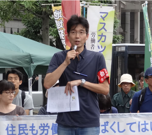 8・6ヒロシマ大行動の中島健さんは「先制核攻撃のオバマと核武装の安倍打倒の8・6ヒロシマへ」。高浜原発の地元、京都府職労舞鶴支部の長岡達也さんは「『行政機関が住民をだまして再稼働を進めるなら、こんな行政はいらない』という声に応え、住民を守る。廃炉の先頭に自治体労働者が立つ」と決意を述べました。NAZEN東京で労組交流センター自治体労働者部会代表、江戸川区職労の佐藤賢一さんは「オリンピック会場の土を掘ったら1万6千ベクレル。東京オリンピックで被曝と被曝労働が強制される」と訴え、動労東京がともに決起した常磐線運行再開反対7・12動労総連合統一行動に続き、7・22東京集会を開催し、被曝労働拒否を闘う決意を表明しました。