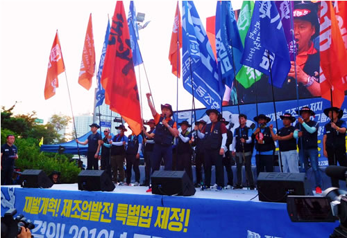 7・20ゼネストに続き、金属労組15万人がストライキ決行! 現代自動車本社前と国会前の2カ所で同時開催された「財閥改革!構造調整阻止!2016賃団闘勝利・金属労組ゼネスト大会」には3万人が結集。写真は、現代車本社前でパククネ政権と財閥資本による労組破壊を弾劾し「責任を必ずとらせる」と宣言するキムサング金属労組委員長(7月22日 ソウル)