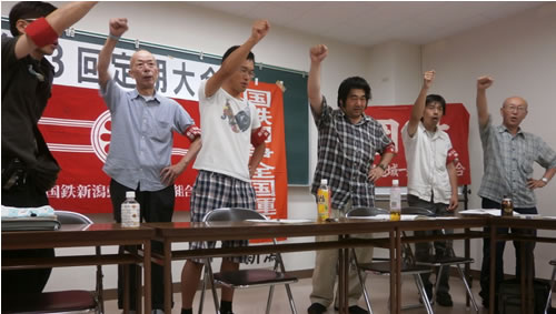 今大会は、この1年の闘いの前進をしっかりと総括し、意気軒昂(いきけんこう)としてJR・NTS非正規職解雇撤回とJRTM再編合理化と闘うこと、改憲・労働法制大改悪阻止へ闘うこと、その中で組織拡大を実現していくことを確認した。
