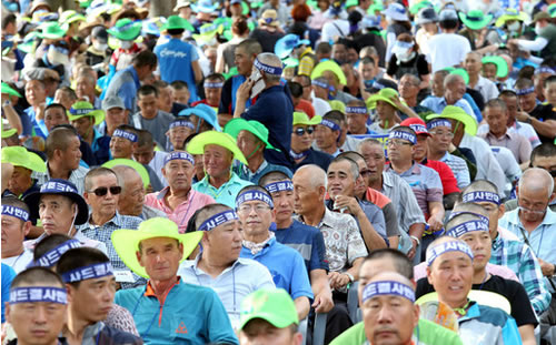 8・15韓国 サード配備撤回せよ 民主労総が労働者大会 星州住民908人抗議剃髪