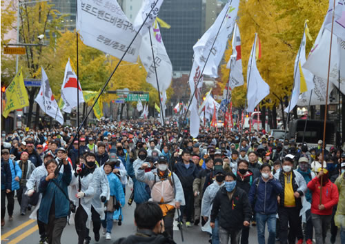 韓国労働運動は、長い間の政権と資本の弾圧を乗り越え、1995年、韓国労働者の団結と闘争の求心として民主労総を結成しました。その後20年間をただ一日も休むことなく闘争を継続しながら前進して来ました。死を辞さない闘争で、解雇と拘束を顧みないストライキで、民主労総の闘争を継続し、親資本極右勢力を代弁する現政権の統治下で、委員長が拘束され、何と5年間監獄に捕えられなければならない弾圧を受けながらも、少しも動揺することなく闘っています。