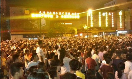 頂点となったのは8月6日〜7日にかけてだった。市の中心にある蘇寧広場に労働者民衆数千人が集まり、核廃棄物処理工場の建設に抗議した。7日の晩、武装警官と衝突し、多くの市民が重い傷害を負う事態となった。政府はマスコミ報道を全面的に規制し、徹底した弾圧を加えた。