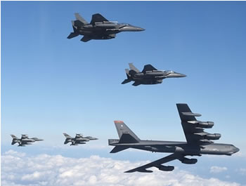 今回の核実験を受け、韓国軍は北朝鮮・キムジョンウンら最高幹部の指揮所を直接攻撃する新たな「大規模制裁・報復」作戦を公表した。さらに韓国の日刊紙『ハンギョレ新聞』によると、「韓国、米国、日本の軍当局が……多様な対話チャンネルを通じて緊密な軍事共助を続けている」という。韓国国防部のハンミング長官は米国防長官カーター、日本の防衛相・稲田朋美と相次いで電話協議し、米カーター長官とは「B52爆撃機と潜水艦の韓国展開など軍事的手段を動員する」ことを議論したと報じられている(同紙9月10日付)。昨年来、米韓連合軍は北朝鮮への新たな全面戦争計画=「作戦計画5015」に基づき、朝鮮半島での史上最大規模の軍事演習や戦力配備の増強を進めてきた。8月には米軍戦略爆撃機B52、B1、B2をグアム基地に配備し、アジア太平洋地域に初めて同時展開させた。これら3機種は、核兵器の管理・運用を管轄する米空軍地球規模攻撃軍団の主要戦力であり、グアムから同時に出撃すれば2〜3時間以内に40発の核爆弾を朝鮮半島に投下できるとされる。