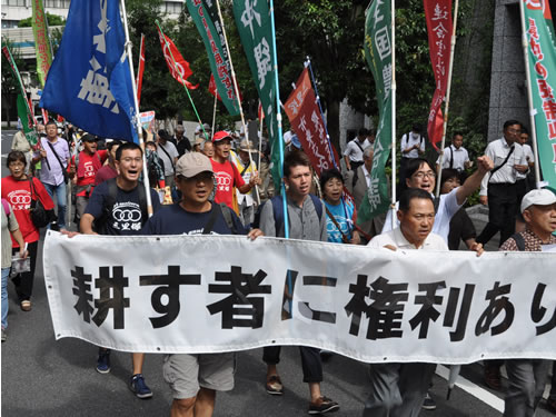 現地への大結集が国家権力との力関係を決める。40回を数える空港周辺地域一斉行動、50年にわたる闘いの継続が地域住民の信頼と共鳴をかちとり、空港労働者にも届き始めている。「反原発・反TPP・三里塚連帯」を掲げる全国農民会議、闘う労働組合を軸に、「市東さんの農地を守る会」の全国的発展をかちとろう。労組旗・自治会旗を押し立てて三里塚現地に大結集しよう!