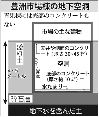 豊洲の主要5施設の地下になされるはずだった汚染対策の「盛り土」がされず、空洞となっていた。実際に生鮮食品を扱う建物の地下の空洞には地下水と見られる汚水が大量にたまり、異臭を発している。