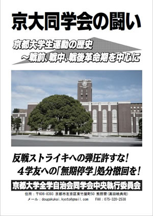 これを読むと、京大学生運動は、日帝の戦争攻撃・天皇制攻撃と真っ向から対決して闘ってきたことがよく分かる。幾度もの国家権力による弾圧、逮捕・投獄にも屈せずに戦争に反対し、学生の自治を守りぬいて不屈に闘ってきた。現在の同学会の闘いはこの歴史を引き継ぎ、発展させている。