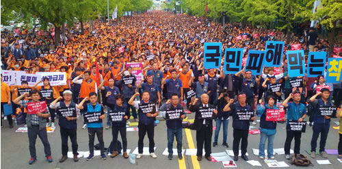 民主労総はパククネ政権との大決戦に突入した。9月27日、鉄道労組を先頭に、地下鉄、ガス、健康保険、国民年金、ソウル大学病院など、公共運輸労組傘下の労働者が一斉に無期限ストに突入。28日には保健医療労組、金属労組などが加わり18万人の大ストライキとなった。28日ソウルでは、ヨイドのKBS本社前の路上に組合員1万6千人が集まってゼネスト大会を開き、「労働者民衆を殺す政権であるパククネ政権を終わらせるために、総力をふりしぼって闘う時が来た」と宣言。11月民衆総決起闘争への進撃を誓い合った。(詳報次号)