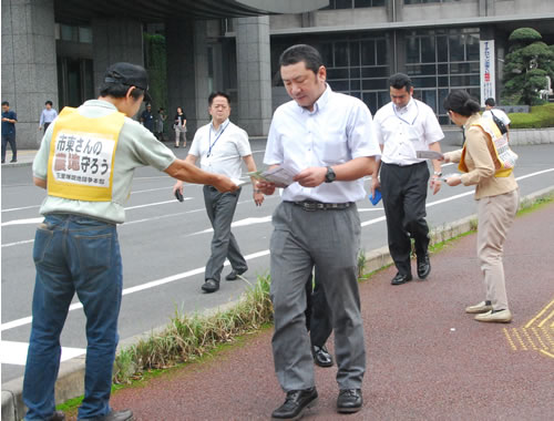 集会を終え反対同盟と支援連は直ちに千葉県庁前で、翌日に幕張で開催予定の「4者協議会」を弾劾する情宣・ビラまきを行った(写真)。昼休み時間、県庁労働者にビラと10・9への大結集を訴えるカラービラがくまなく配られた。