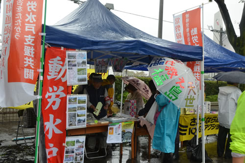 「被曝労働拒否をたたかう動労水戸支援共闘」がブース出店し、新鮮な感動をもたらした。動労水戸の執行委員である池田学さん、杉井文彦さん、坂場力男さん、書記の西納岳史さんがテントの内外で訴えた。こうした集会の出店で、労働組合として被曝労働拒否のストライキに決起していることが宣伝されるのは、初めてのこと。