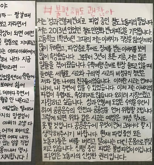 成果主義賃金絶対阻止を掲げた民主労総のゼネストは、パククネ「労働改革」の本質を暴き、今や全社会にストへの支持を拡大している。ストが長期化する中で、「不便でも大丈夫! ストを支持する市民」という壁新聞が、地下鉄の駅や大学街に貼り出されている。 その一つ、「私はストライキ中の鉄道労働者の娘です」で始まる壁新聞は、2013年の鉄道ストの時には高校1年生で父が職を失うのではないかとひたすら恐れていたが、その後に起きたセウォル号事件や地下鉄での事故を見て、同じ惨事が自分の身に起きてもおかしくないと思ったと語っている。そして「今私は父のストライキを恐れても気にしてもいません。むしろ誇り、自慢したいと思います」「現在ストライキ中のすべての労働者たちは、(セウォル号の船長のように)船を捨てて逃げる代わりに全身でぶつかっています」と、このゼネストが社会の変革をかけた闘いであることを強調している。